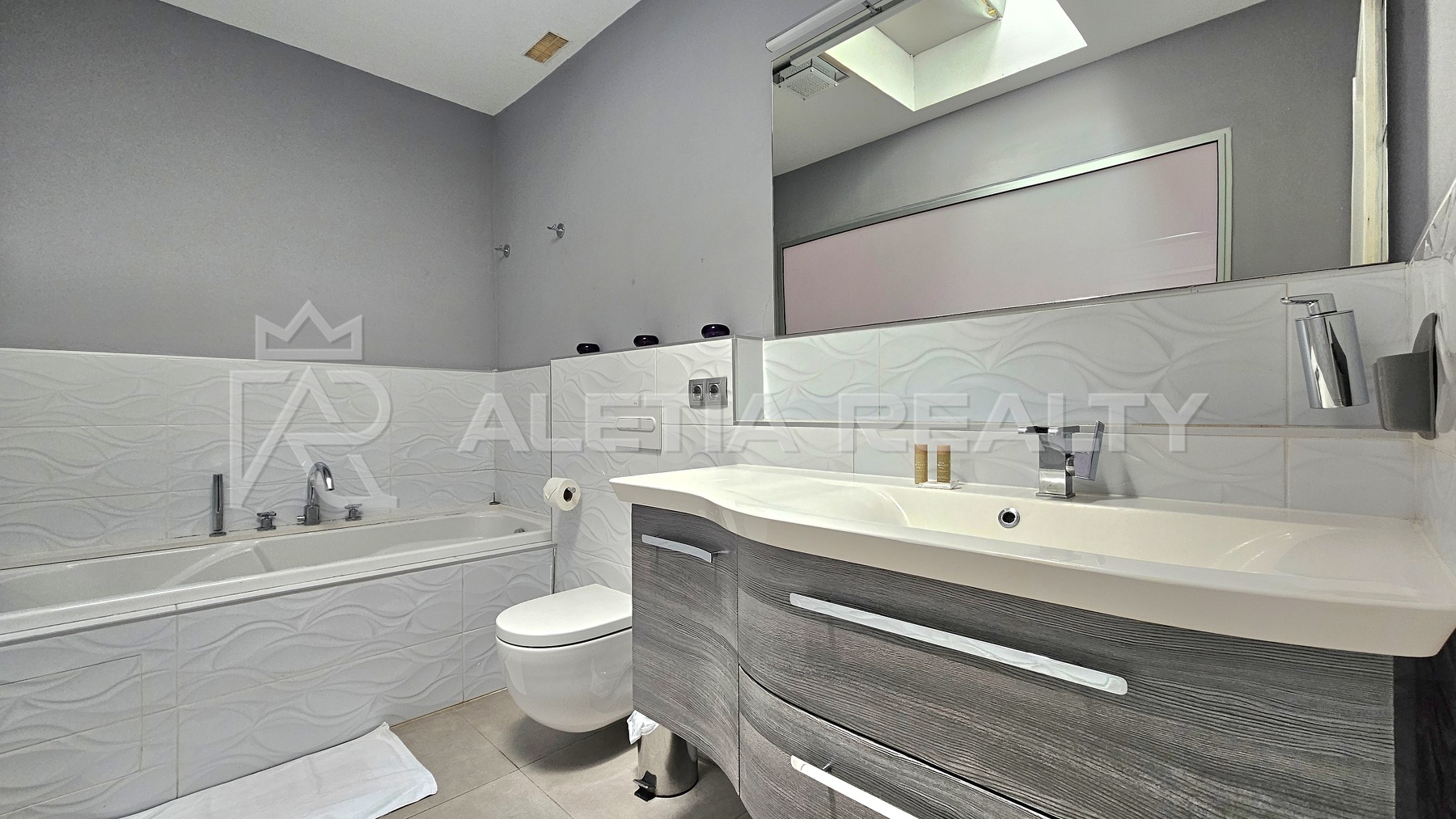 In the semi-basement there is a large closed garage and storage room. From the garage, a staircase takes you to the lower floor, where there is a spacious living room with an American kitchen with access to a large terrace with stunning sea views.